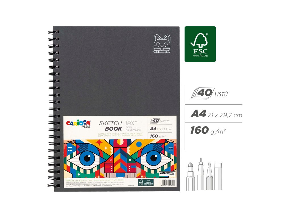 edinečná kolekcia kreatívnych potreb vytvorená v spolupráci s umeleckým duom Van Ortonovcov predstavuje moderný dizajn, výrazný štýl a prémiovú kvalitu. Je určená všetkým kreatívnym nadšencom a profesionálnym umelcom. Carioca PLUS vám poskytne nástroje, ktoré premenia nápady na majstrovské diela. Pripojte sa k novej generácii umelcov a objavte svet plný farieb a nekonečných možností. S kvalitným hladkým papierom, ktorý dokonale drží farby, sa deti môžu ponoriť do sveta kreativity a nechať svoje skice, kresby či nápady ožiť. Či už ide o prvé náčrty alebo precízne umelecké dielo, tento blok poskytne pevný základ na všetky tvorivé výzvy. S blokom Carioca PLUS sa každý malý umelec stáva tvorcom vlastného sveta plného fantázie! formát: 21 × 29,7 cm (A4), na výšku 40 listov, 160 g/m2 bez obsahu kyselin, tzv. acid free jemne zrnitá struktura papiera vhodný na kresby perom, pastelom, grafitovou tužkou alebo linerom tvrdé desky, perforácia a spirálová väzba FSC certifikátDodatočné parametre