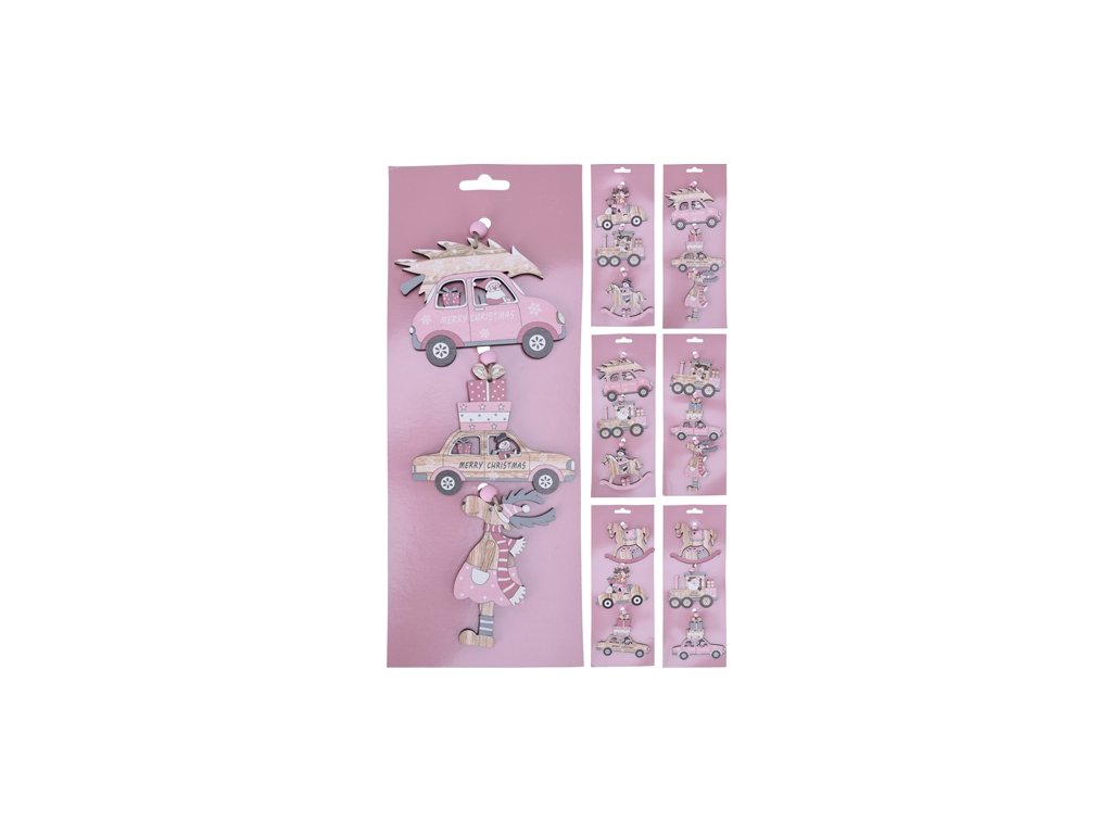 Drevená dekorácia na vianočný stromček s vianočnými postavičkami. Materiál: drevo. Výška postavičiek cca 65 až 87 cm. Dĺžka šnúrky cca 8 cm. Balenie obsahuje 3 ks.Dodatočné parametre