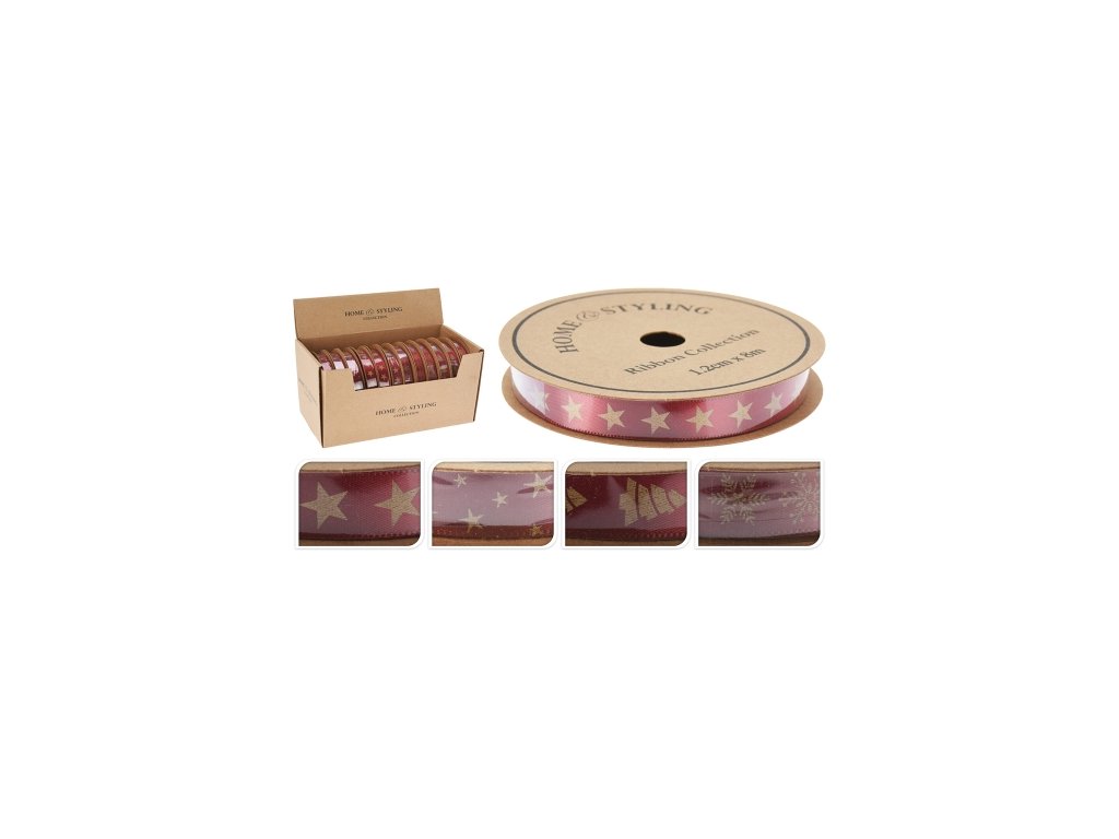 Dekoračná stuha 12x8000 mm červená (mix 4 vzorov, cena /1 ks) Stuhy v červenej farbe potlačené vianočnými motívmi, vhodné na balenie darčekov, ako dekorácia a pod. šírka stuhy: 12 mm /návin 8 m vzory: Malá hviezda /Veľká hviezda /Snehová vločka /Vianočný stromček materiál: Polyester Balenie obsahuje 12 ks mix vzorov. Cena je za 1 kus / vzor vyberáme náhodne podľa skladovej dostupnosti.Dodatočné parametre