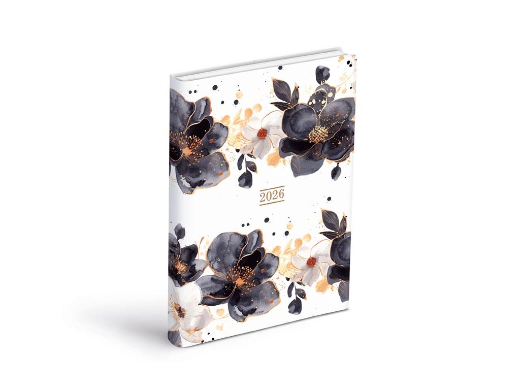 Štýl, ktorý vynikne – každý deň v roku! Hľadáte diár, ktorý je nielen praktický, ale aj vizuálne výnimočný? Tento denný diár pre rok 2026 vo formáte A5 očarí výrazným kvetinovým motívom v hlbokých tónoch čiernej a šedej, doplneným o jemné zlaté detaily. Moderný a pritom nadčasový dizajn sa skvele hodí na každodenné použitie aj ako elegantný doplnok na stole. Mäkčený povrch obálky (PU soft) je príjemný na dotyk a odolný voči opotrebovaniu. Odtrhávacie spodné rožky uľahčujú rýchle nalistovanie aktuálneho dňa – praktický detail, ktorý oceníte. Vnútri nájdete denné rozvrhnutie, ktoré poskytuje dostatok priestoru na poznámky, schôdzky aj vaše osobné postrehy. DIÁR OBSAHUJE: - priestor pre osobné údaje - ročný prehľad roka - plánovací kalendár - štvrťročný plánovací kalendár - abecedný zoznam mien - štátne sviatky - medzinárodné sviatky - mapy - menné kalendárium - číslovanie týždňov - štátne sviatky a významné dni - východy a západy Slnko - fáza mesiaca - letné a zimné kvety Väzba: šitá V8 Rozsah: 336 strán Rozmer: 140 x 205 mm Kalendárium: československé denné Povrchy a spracovanie obálky: PU soft Uvedená cena je za 1 ks. Hmotnosť: 0.47 kgDodatočné parametre