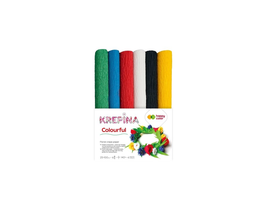 Krepový papier Happy Color 25x100 cm - mix 6 farieb Colorful Sada farebného krepového papiera vhodná na tvorbu kvetov a pod. 6 farieb v sade - verzia COLORFUL hrubý, odolný a pružný pri naťahovaní farby vhodné na vytváranie originálnych kytíc kvetov v každom balení sú dva podrobné návody ako vytvoriť kvetyDodatočné parametre