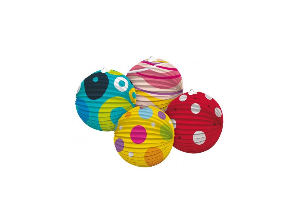 Papierový okrúhly farebný lampión. Vhodná dekorácia na párty, lampiónový sprievod, záhradnú slávnosť, karneval, narodeninovú oslavu alebo len tak na zavesenie v detskej izbe. Vyberte si svoj lampión a urobte z obyčajného večera čarovný. Lampión je vyrobený z nehorľavého papiera a má držiak na sviečku alebo žiarovku. Lampión je bez prútika a svetla. Lampión má pútko na zavesenie. Materiál: papier, kov Priemer lampiónu: 25 cm Motívy: bodky, kruhy, čiary Dodávame v mixe 4 ks podľa skladovej zásoby. Uvedená cena je za 1 ks. Hmotnosť: 0.06 kgDodatočné parametre