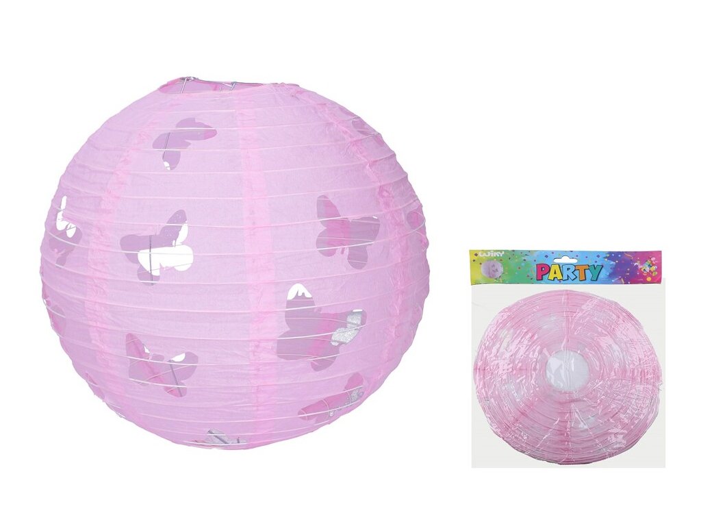 Lampión Motýľ guľa 30 cm Lampión je papierová svietiaca ozdoba. Lampióny môžu byť rôznych tvarov, veľkostí a konštrukcií. Ich svetielka žiariace v tme hýria cez farebný obal všetkými farbami a zaručene oživia každý strašidelný sprievod alebo rozžiari neobyčajnú oslavu. Vyberte si svoj lampión a urobte z bežného večera čarovný. Lampión je bez prútika a svetielka Farba: ružováDodatočné parametre