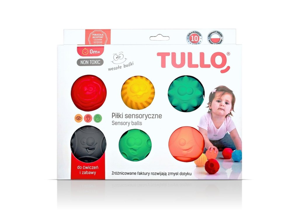 Loptičky stimulačné 6ks Sada šiestich mäkkých senzorických hračiek navrhnutých pre senzorickú integráciu a zábavné cvičenie. Každá hračka má inú veľkosť a odlišnú štruktúru a poskytuje tak rôzne senzorické vnemy. Stimulujú senzorické receptory, zlepšujú úchop, stimulujú pocit zraku. Sú počas obdobia lezenia nenahraditeľné, batoľa s nimi môže napr. gúľať. Tiež sú vhodné pri raste zubkov, pretože senzorické výstupky na balóniku masírujú ďasná. Samozrejmosťou vo výrobe je použitie zdravotne nezávadných materiálov, spĺňajúce náročné hygienické normy. Neobsahujú ftaláty, BPA, ťažké kovy. Vhodné pre všetky vekové kategórie. Sada 6 loptičiekDodatočné parametre