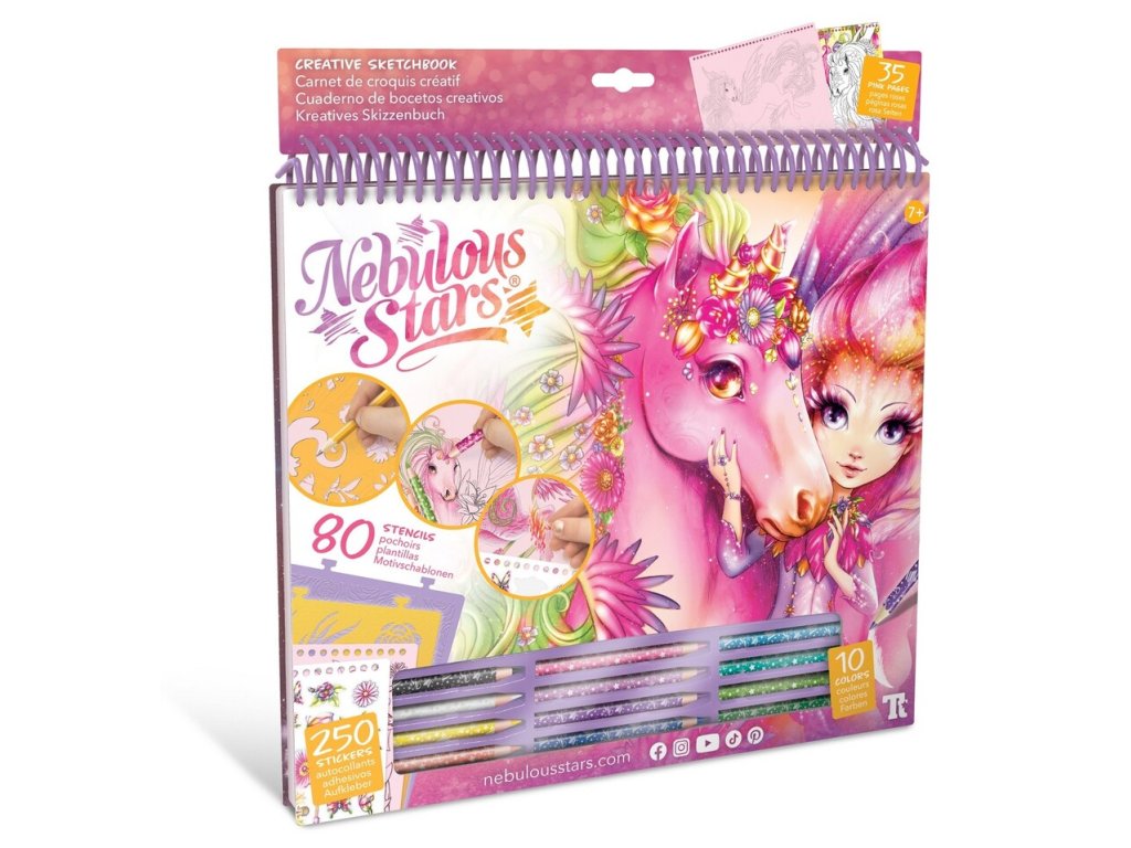 Náčrtník Nebulous Stars Forest Horses Vytvorte mystické a ohromujúce fantasy kone hodné lietania v magickej hmlovinovej oblohe Použite množstvo nálepiek, šablón a techník na navrhnutie koníkov Petúlie a Hazelie. 35 ružových skicových strán 80 šablón 4 natieracie vzory 250 nálepiek 12 farebných ceruziek 12 techník kreslenia a príbeh koňa Teória farieb Pokyny k farbeDodatočné parametre