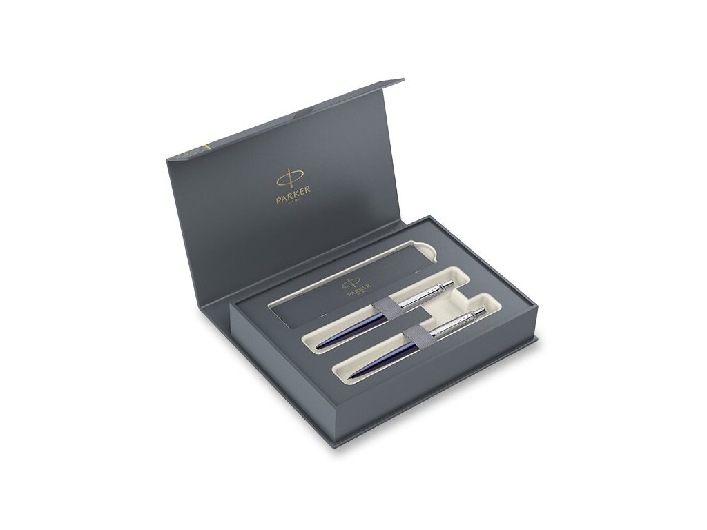 Súprava DUO obsahuje guľôčkové pero Parker Jotter Royal Blue a mechanickú ceruzku Parker Jotter Royal Blue. Modré lakované telo z brúsenej nehrdzavejúcej ocele, vrchná časť z brúsenej nehrdzavejúcej ocele. V kombinácii s chrómovanými doplnkami z nehrdzavejúcej ocele s lešteným povrchom. Dodávané v darčekovej krabičke.Dodatočné parametre