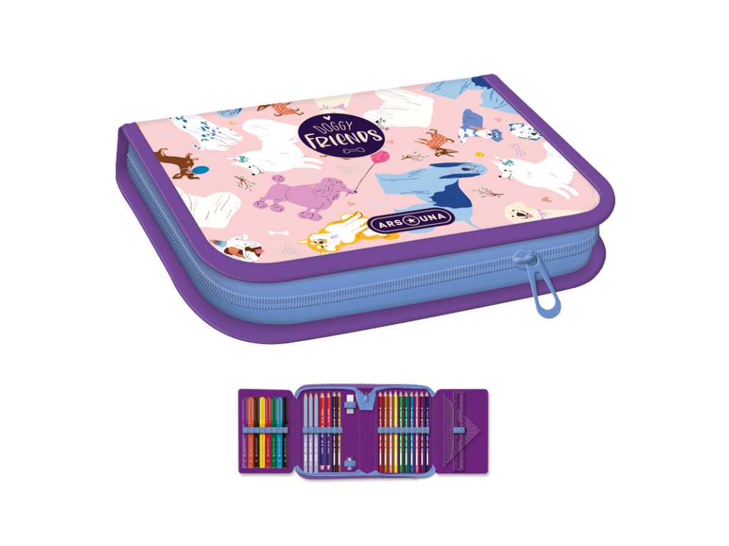 Školský jednoposchodový peračník s 2 klopmi - naplnený s kompletnou výbavou Obsahuje: Pastelky - 12 ks základné farby grafit ceruzky- 3x, fixky - 10 ks základné farby, 2 pravítka- 1x rovné s výrezmi kružnice 16cm a 1x trojuholník 14 cm, strúhadlo, guma, Na klope je priehľadná kapsa, vhodné miesto na školský rozvrh hodín. Rozmer: 200 x 140 x 40 mm. Povrch peračníka je pokrytý textíliou.Dodatočné parametre