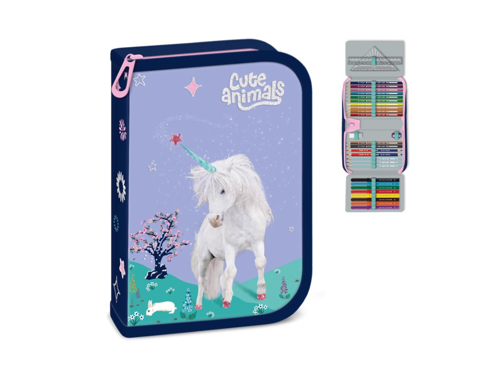 Školský jednoposchodový peračník s 2 klopmi - naplnený s kompletnou výbavou Obsahuje: Pastelky - 12 ks základné farby grafit ceruzky- 3x, fixky - 10 ks základné farby, 2 pravítka- 1x rovné s výrezmi kružnice 16cm a 1x trojuholník 14 cm, strúhadlo, guma, Na klope je priehľadná kapsa, vhodné miesto na školský rozvrh hodín. Rozmer: 200 x 140 x 40 mm. Povrch peračníka je pokrytý textíliou.Dodatočné parametre