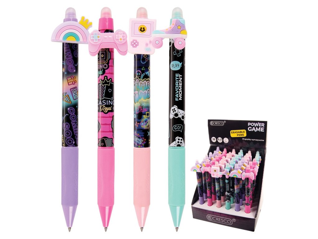 Gumovacie guľôčkové pero pre deti s motívom hry (4 dizajny v balení). jemná stopa (hrot) 0,5 mm modrý gumovací atrament stlačením gumeného motívu hry sa vysunie / zasunie tuha gumový, trojuholníkový úchop pre pohodlné držanie pera pri písaníDodatočné parametre