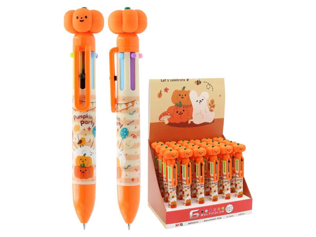 6 farebné guľôčkové pero pre deti z jesennej kolekcie Pumpkin Party. stopa (hrot) 0,7 mm farby atramentu: čierna, svetlo-modrá, fialová, ružová, oranžová, svetlo-zelená gumená hlava tekvičky na vrchu peraDodatočné parametre