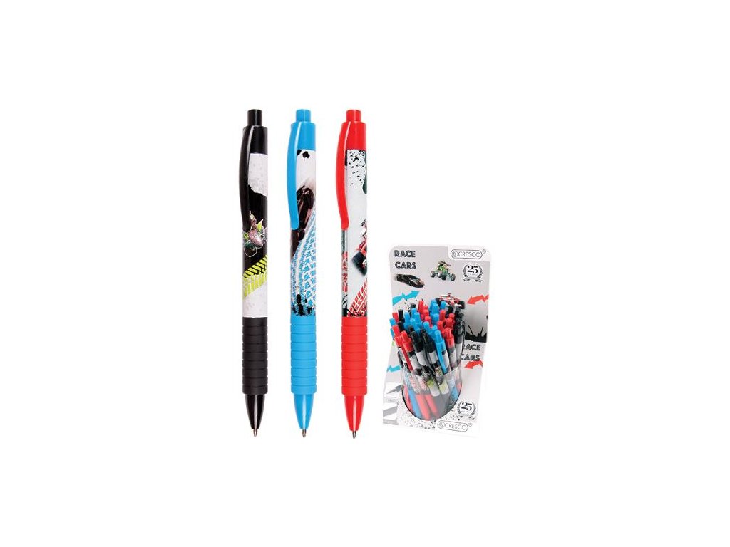 Guľôčkové pero s plastovým telom a ergonomicky tvarovaným gumovým úchopom. Pero má príjemné vyhotovenie s pogumovaným povrchom. Náplň modrá, šírka hrotu 1.00 mm. Dizajn: Race Cars.Dodatočné parametre