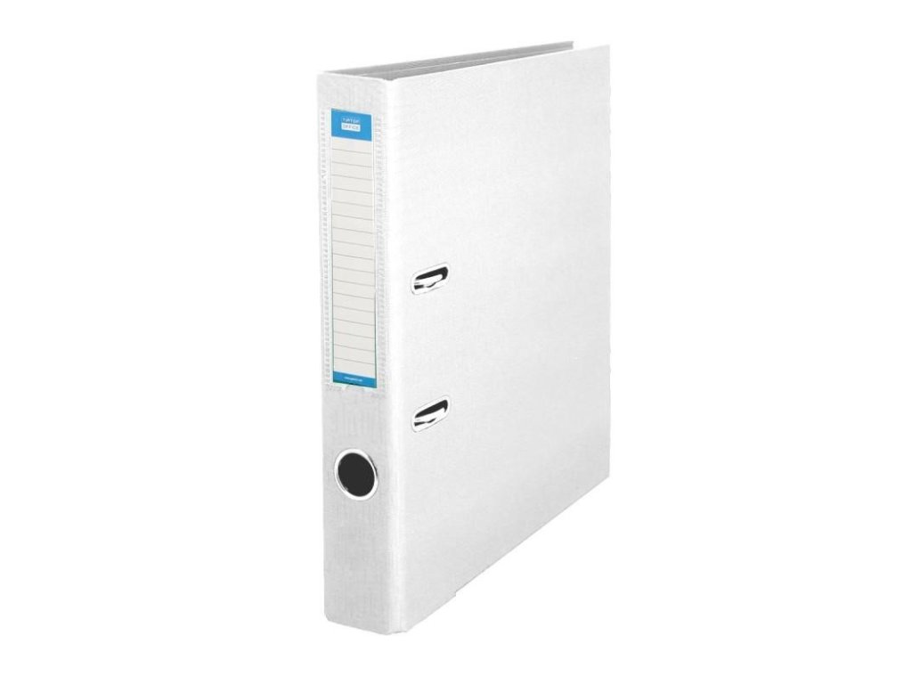 Poradač pákový Office A4 50 mm - biely Pákový zakladač na dokumenty formátu A4. odolný vďaka laminácii s protišmykovou PP fóliou pákový mechanizmus so zariadením na pridržiavanie tlaku hrany a kruhový otvor s kovovým rámikom materiál: kartón s PP lamináciou prstokrúžok, radokrúžok šírka chrbta: 5 cm priehľadné vrecko na chrbte (vymeniteľný štítok) Rozmery _25 x 5 x 32 cm (šírka x hĺbka x výška)Dodatočné parametre