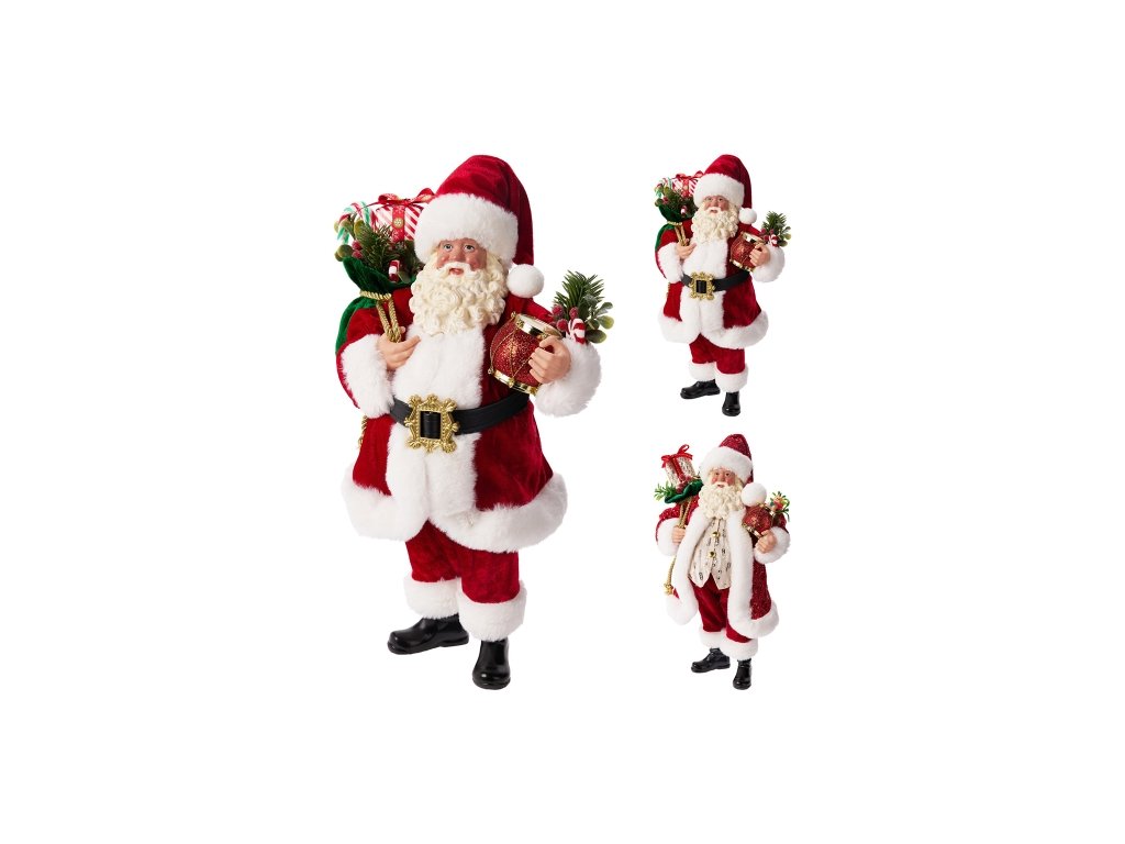 Stojaci Santa v červenom kabáte a čiapkou držiac vianočné darčeky. rozmer cca: 23x13x38 cm hmotnosť: 600g materiál: polyester, plast, kov Cena je za 1 kus / variantu vyberáme náhodne podľa skladovej dostupnosti.Dodatočné parametre