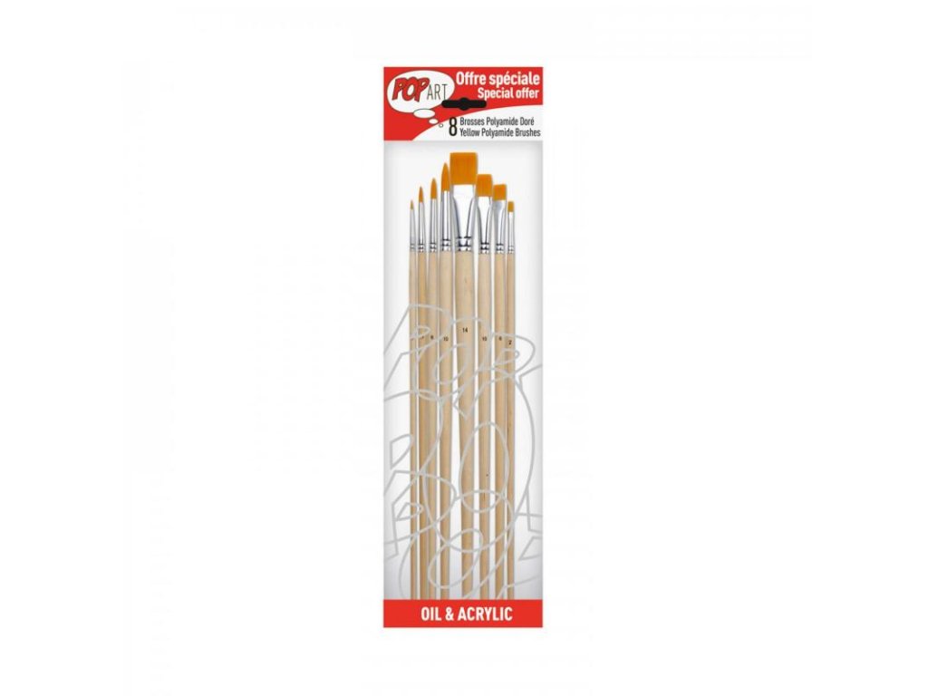 Sada 8 plochých polyamidových štetcov vynikajúcej kvality a trvanlivosti, ideálnych na maľbu akrylovými alebo olejovými farbami. Sú výborné aj na použitie s hobby farbami. Balenie obsahuje 4 ks plochých štetcov n° 2, 6, 10, 14 a 2 ks guľatých štetcov n° 0,3, 6, 10.Dodatočné parametre