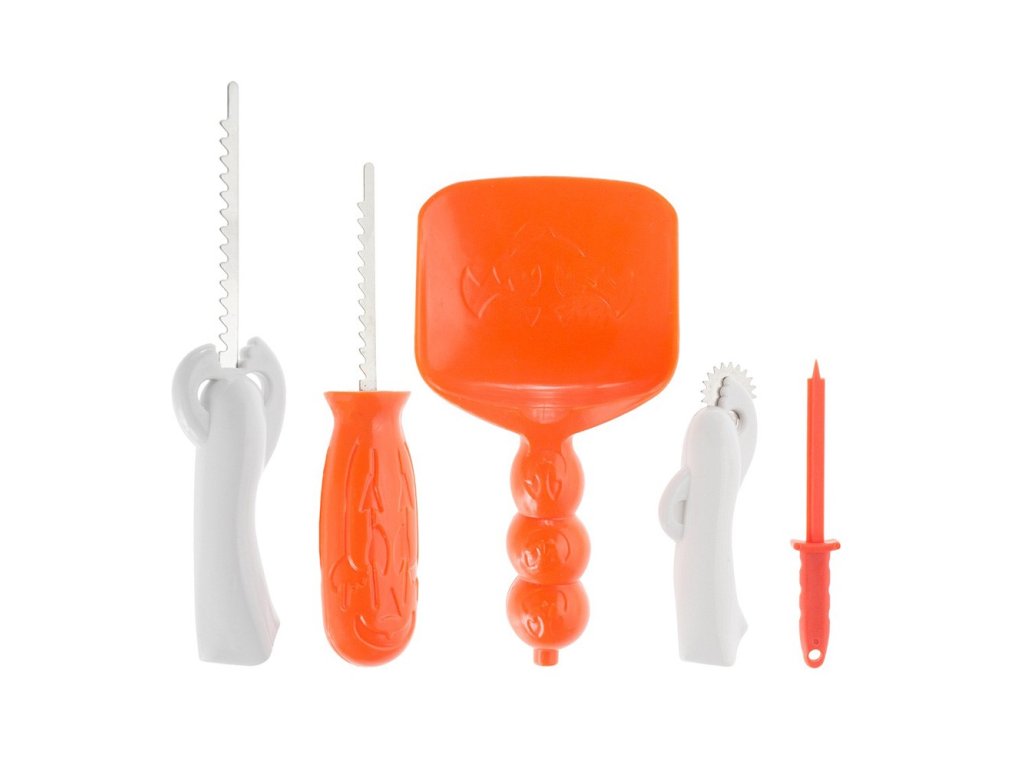 Náradie na vyrezanie vlastnej, originálnej Halloweenskej tekvice. Sada obsahuje: 1. Pílu na vyrezanie vrchnáka a veľkých častí vzoru 2. Menšia, veľmi ostrá gulička pre presné rezanie 3. Stierka na vydlabanie stredu tekvice a vykrojenie hrúbky prednej steny tekvice 4. Kruhový nôž na vystrihnutie vzoru 5. DlátoDodatočné parametre