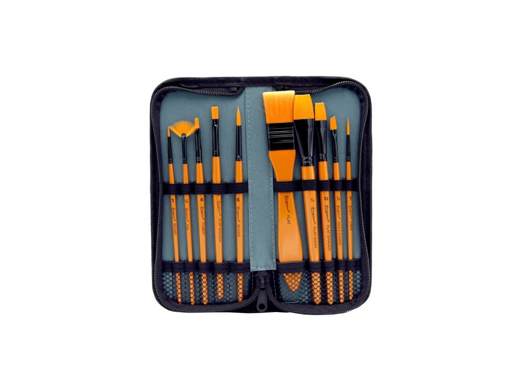 Sada 10 ks štetcov pre výtvarných umelcov v praktickom obale na zips ktoré chráni štetce pred poškodením a je kompaktné na prenášanie. nylonový vlas vysokej kvality štetce ploché č.: 1/4, 3/4, 2/0, 4, 6, 12, 25 mm (rovný, zkosený tvar štetín) štetce guľaté č.: 2x 1, 6 puzdro vybavené pútkami na gumičku, materiál PolyesterDodatočné parametre