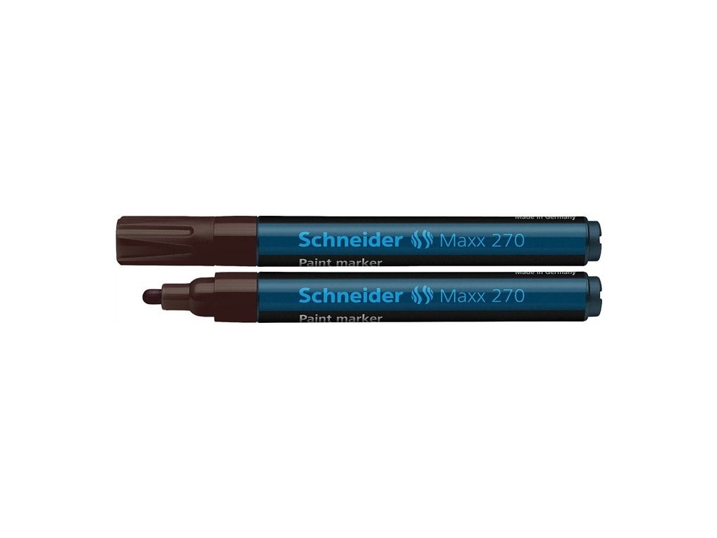 Lakový popisovač, 1-3 mm, SCHNEIDER "Maxx 270", hnedý vhodné takmer na všetky povrchy (sklo, kov, porcelán, keramika, plast, guma, koža, papier, kartón) na alkoholovej báze (bez xylolu a toluolu) vodeodolný, nezotierateľný rýchloschnúci atrament vhodný aj do exteriérov farba uzáveru sa zhoduje s farbou náplne vyrobený ventilovou technológiou hrúbka písma: 1–3 mmDodatočné parametre