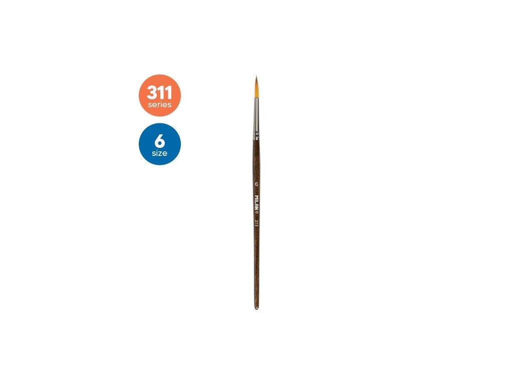 Štetec guľatý MILAN č. 6 - 311 Šetec je vyrobený z kvalitných syntetických vlákien o priemere 0.1mm, zlatej a hnedej farby. Štetec je vhodný na maľovanie vodovými a akvarelovými farbami a vďaka odolnosti štetín zvládne aj akrylové a olejové farby. Priemer štetín: 4,1 mm. Dĺžka štetín: 18,2 mm. Dĺžka štetca: 183 mm.Dodatočné parametre