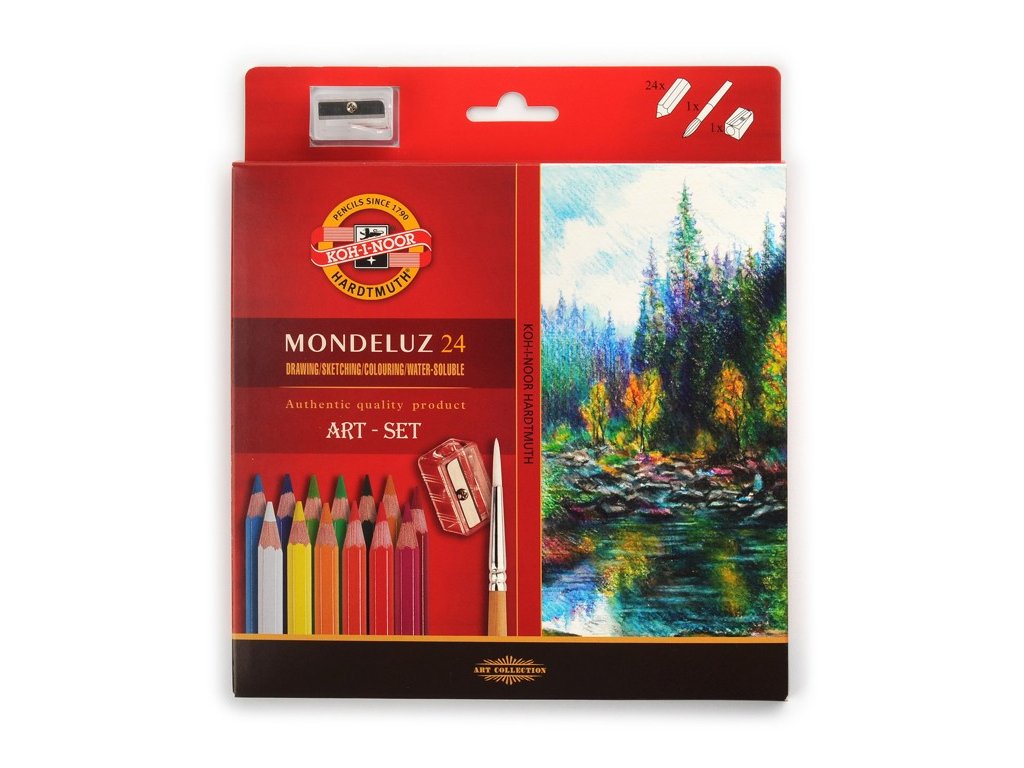 Umelecké (nemáčané) akvarelové pastelky MONDELUZ (z lipového dreva) s vodou rozmývateľným efektom. 6-hranné, značené, dĺžka pastelky 175 mm, hrúbka pastelky 6,9 mm, hrúbka tuhy 3,8 mm, Sada obsahuje: 24ks pastelky, okrúhly štetec, 1ks strúhadloDodatočné parametre