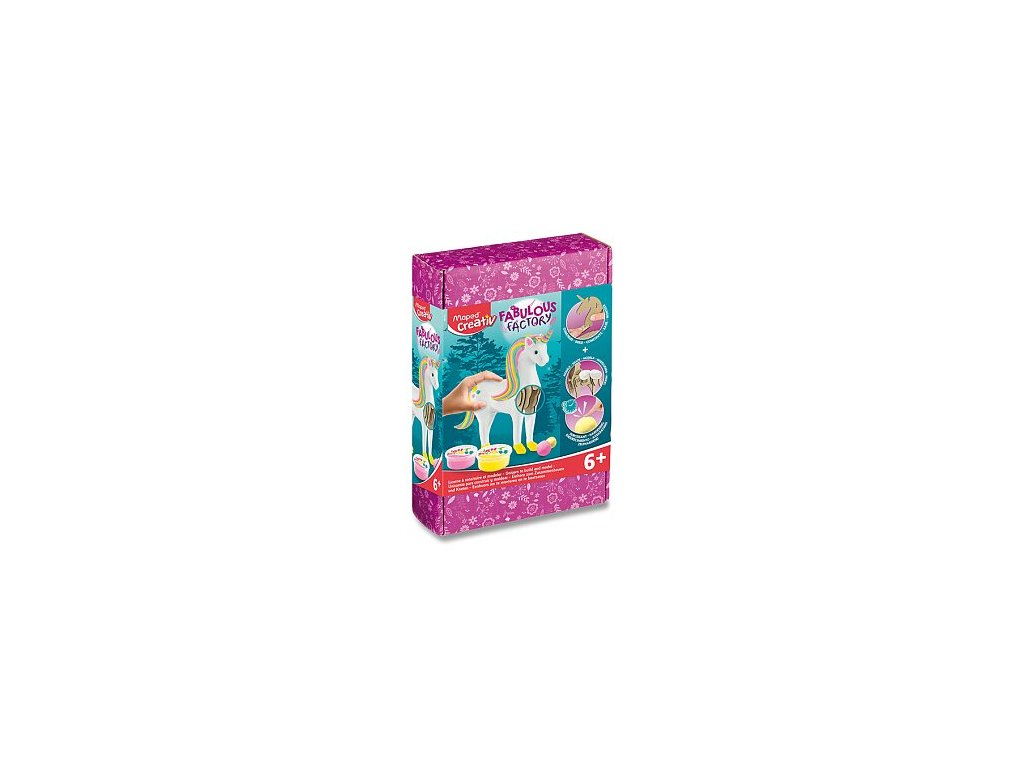 Detská kreatívna sada Maped Creativ Fabulous Factory Unicorn na vytvorenie 3D figúrky jednorožca. Vymodelovaná figúrka po 4 hodinách zatvrdne a je možné sa s ňou hrať. Sada obsahuje drevené prelisy s očíslovanými dielikmi 3D puzzle, modelovaciu hmotu v 4 svetlých farbách (6 x 18 g).Dodatočné parametre