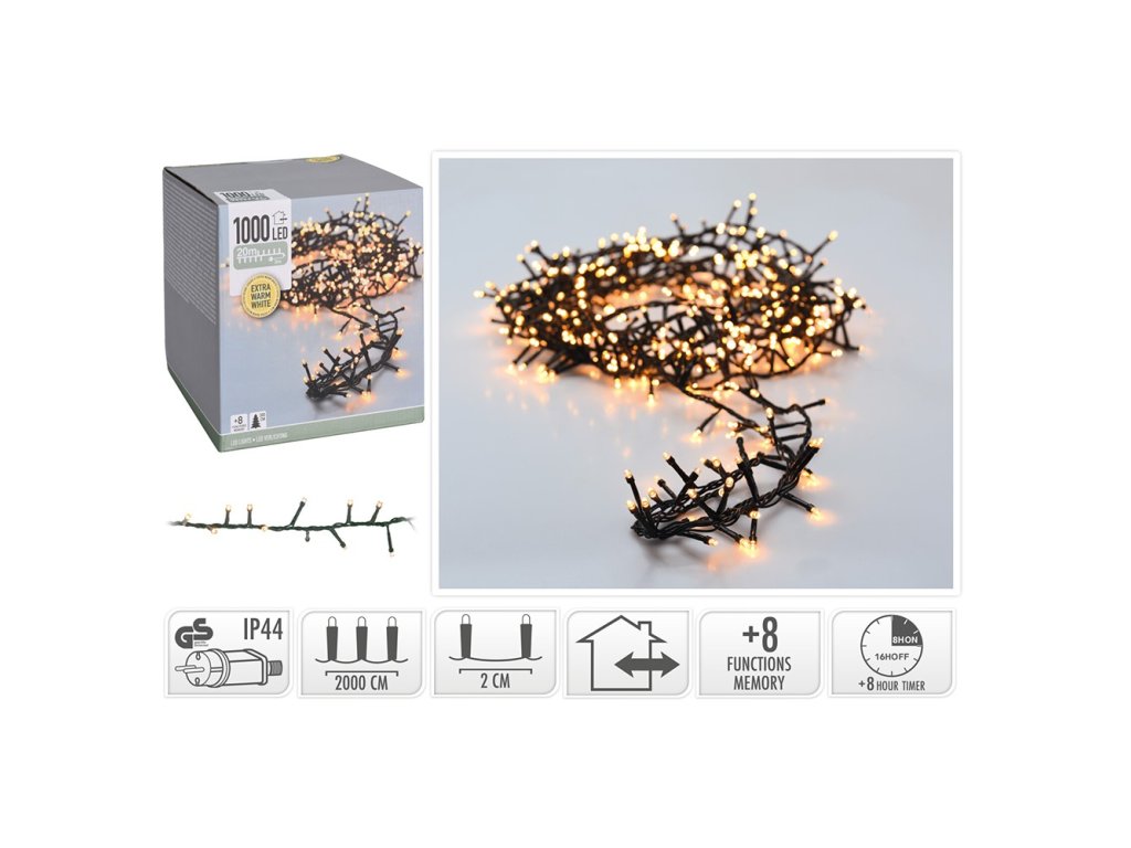 Svetelná reťaz 1000 LED extra biela teplá Svietiaca reťaz obsahuje 1000 LED o priemere 5 mm vhodná na vianočný stromček o výške 270 cm celková dĺžka reťaze: 23 m dĺžka prívodného vodiča: 3 m farba vodičov: zelená rozostup medzi jednotlivými LED: 2 cm 8 režimov svietenia s pamäťou časovač: svieti 6 hod / nesvieti 18 hod napájací adaptér 230V /31VA vhodné na vonkajšie i vnútorné použitie (krytie IP44)Dodatočné parametre