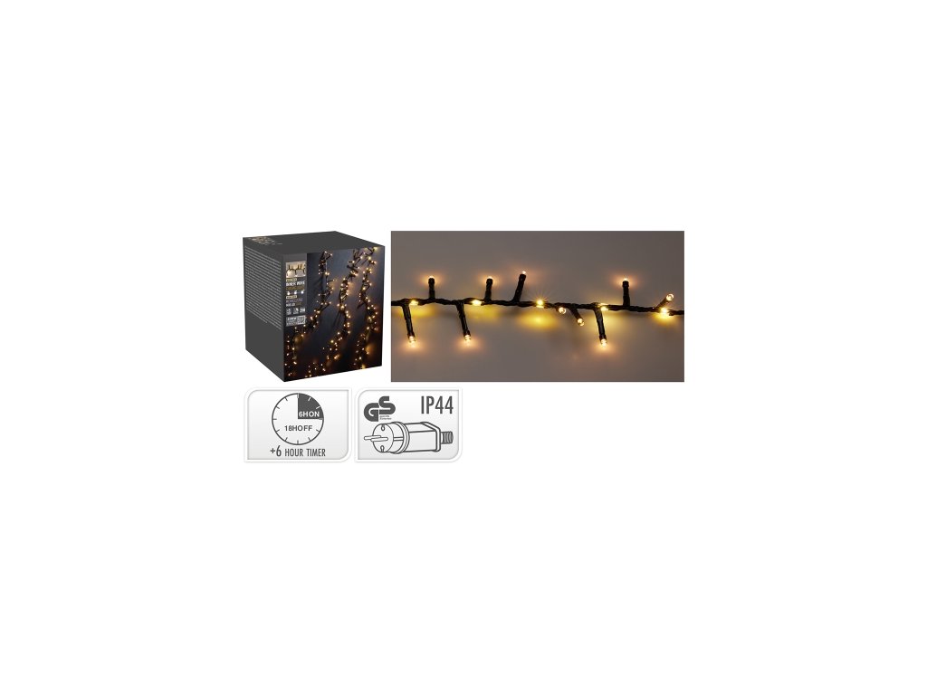 Svietiaca reťaz obsahuje 1410 LED o priemere 5 mm s efektom padajúceho vodopádu. dĺžka prívodného vodiča: 3 m farba vodičov: čierna rozostup medzi jednotlivými LED: 2 cm (microcluster) režim svietenia: trvalo zapnuté /kombinácia /rýchlosť 1, 2, 3 /vypnuté časovač: svieti 8 hod / nesvieti 16 hod napájací adaptér 230V vhodné na vonkajšie i vnútorné použitie (krytie IP44) Rozmery _175 x 175 x 200 mm (balenie)Dodatočné parametre