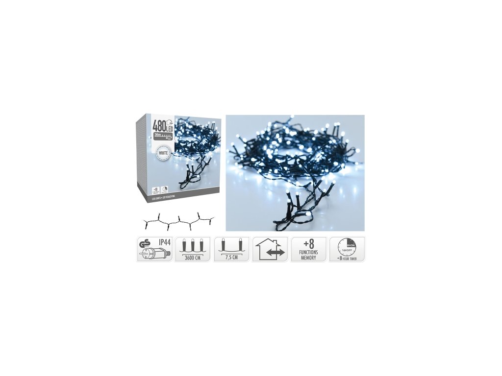Svetelná reťaz 480 LED biela studená, dĺžka 36 m, vonk. použitie, 230V Svietiaca reťaz obsahuje 480 LED o priemere 5 mm. celková dĺžka reťaze: 39 m dĺžka prívodného vodiča: 3 m farba vodičov: zelená rozostup medzi jednotlivými LED: 7,5 cm 8 režimov svietenia s pamäťou časovač: svieti 6 hod / nesvieti 18 hod napájací adaptér 230V vhodné na vonkajšie i vnútorné použitie (krytie IP44)Dodatočné parametre