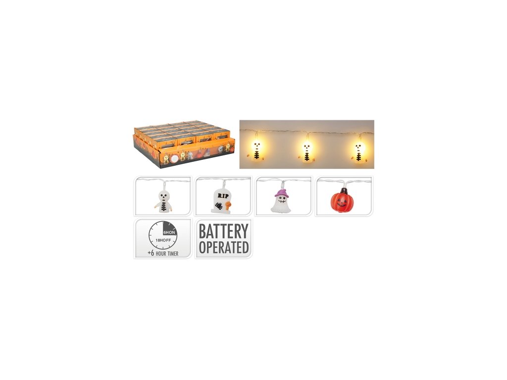 Svietiaca reťaz /girlanda obsahuje 10 LED s Halloween figúrkami. celková dĺžka reťaze: 165 cm dĺžka prívodného vodiča: 30 cm LED biela teplá rozostup medzi jednotlivými LED figúrkami: 15 cm časovač: svieti 6 hod / nesvieti 18 hod batérie: 2x AA 1,5V (nie sú súčasťou balenia)Dodatočné parametre