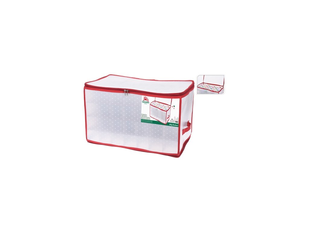 Praktický úložný box na vianočné ozdoby s dvomi ušami na ľahké prenášanie a vekom so zipsom. - mriežka vo vnútri, 4 poschodia - uchová až 112 ks ozdôb (do priemeru 80 mm) - box vo vianočnom motíve Hmotnosť: 942g Materiál: Polyvinyl, kartón (vlnitá lepenka)Dodatočné parametre