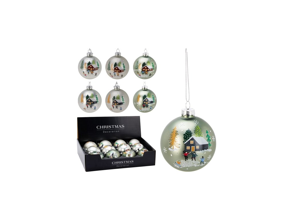 Vianočná guľa trojfarebná - jemne sivá / strieborná / zelená. priemer ozdoby: 8 cm čiapka a šnúrka striebornej farby motív: zimná koláž sklo Cena je za 1 kus / variantu vyberáme náhodne podľa skladovej dostupnosti.Dodatočné parametre