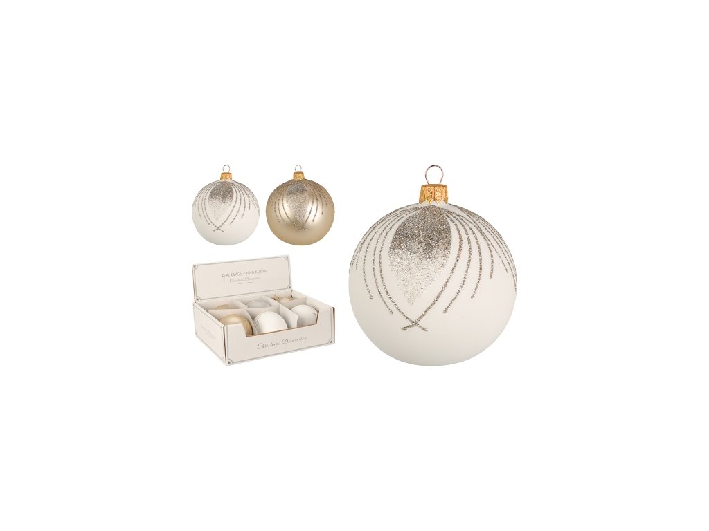 Vianočná guľa ručne fúkaná s glitrovaným dekorom pávieho pierka (2 varianty). priemer ozdoby: 10 cm čiapka zlatej farby biela s perleťovým dekorom /zlatá s perleťovým dekorom materiál: skloDodatočné parametre