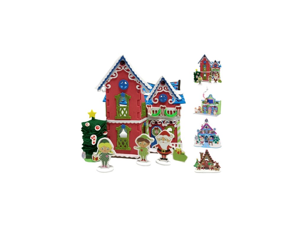 Vianočná scéna 180x65x205 mm (červený, hnedý, zelený, modrý domček) remeselne vypracovaná